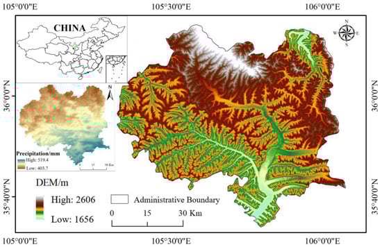 Xiji County is located in the southern mountainous area of the Ningxia Hui Autonomous Region (105°20′-106°04′, 35°35′-36°14′). The county has convenient transportation, with an east–west length of about 67 km, a north–south width of about 74 km, and a total area of 3130 km2 (Figure 1). Three seasonal rivers are developed in the county, including the Qingshui River, Hulu River, and Zuli River. According to the local geomorphic characteristics, it can be divided into three secondary geomorphic units: the loess hilly and gully area, earth rock mountain area, and river valley. The hilly loess area accounts for 83% of the total area. The terrain is high in the north, low in the south, high in the east, and low in the west. The altitude is between 1656 and 2606 m. Xiji County has a fragile ecological environment, with an average annual temperature of 12.7 °C and an average annual precipitation of 570.2 mm. Precipitation is mainly concentrated from July to September. The land types in the county are complex and diverse, with deep soil layers and loose soil quality. Affected by the 1920 Haiyuan earthquake, which had a magnitude of 8.5, a large number of new landslides were formed in Xiji County after the earthquake. At the same time, due to the impact and damage of the earthquake, the rock and soil mass structure in some parts of the area is loose, which increases the possibility of collapses and landslides in the area [].