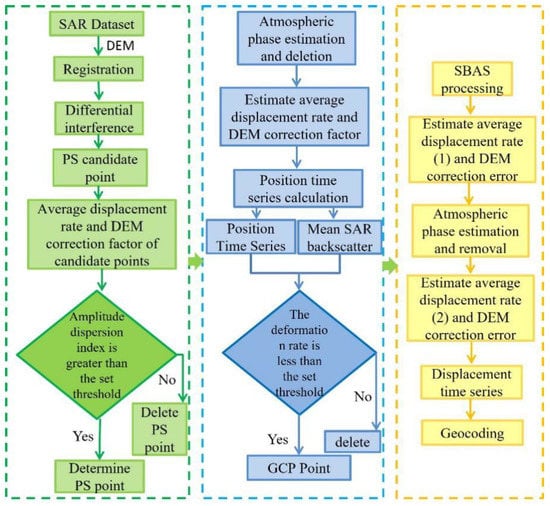 The complex terrain, vertical and horizontal ravines, large fluctuation of elevation difference, and luxuriant vegetation in mountainous areas lead to the inability of traditional survey and monitoring methods to obtain regional surface damage, which affects the identification of geological hazards and risks. Although the PS technique is limited to linear deformation, GCP points with high coherence can be obtained; SBAS has a good application effect in analyzing distributed targets. Therefore, based on the complementary advantages of the two methods, this paper combines PS-InSAR and SBAS-InSAR technologies to obtain the surface deformation monitoring results. Compared with using the PS-InSAR or SBAS-InSAR technologies, it can effectively reduce the error caused by SAR data processing and increase the accuracy of the results. In data processing based on SBAS-InSAR technology, highly coherent GCP points obtained by PS-InSAR technology are introduced during orbital refining to remove residual phase information, better eliminate the flat-ground effect, and improve the accuracy of SBAS-InSAR technology processing results. The specific operation steps are as follows: (1) data preprocessing: due to the large amount of original data, the research area is cut to reduce data processing time and improve efficiency; (2) PS InSAR technology extracts highly coherent GCP points: set parameters such as deformation sampling frequency, residual height sampling frequency, spatiotemporal correlation filtering, and coherence coefficient threshold to reduce atmospheric phase error and obtain high-quality and stable GCP points; (3) SBAS-InSAR technology differential interference calculation: By setting a specific spatiotemporal baseline threshold value, the interference relative is generated. Then, registration, leveling, filtering, phase unwrapping and coherence calculations are performed to obtain the phase diagram and unwrapping diagram after de-leveling and filtering; (4) track refining and re-leveling: GCP points obtained by PS-InSAR technology are introduced to eliminate the leveling effect; (5) temporal domain deformation calculation: the atmospheric phase is effectively removed by two SBAS inversions to obtain the deformation rate and deformation quantity. The processing is shown in Figure 2.