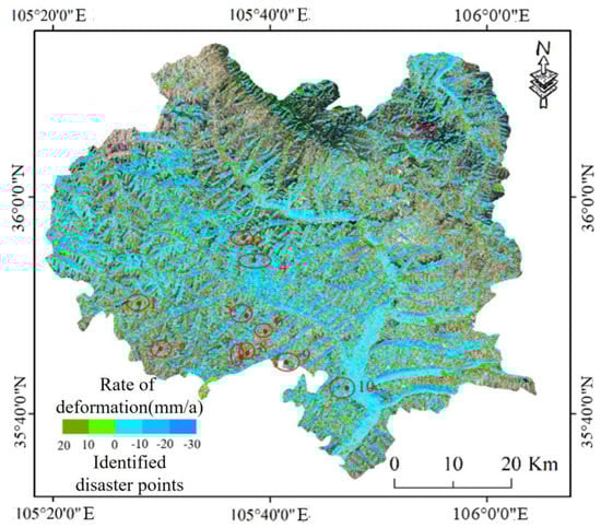 SARScape5.2 software was used to process the data, the results were imported into the Arcgis10.3 software for density segmentation, and the optical remote-sensing image base map was added. Finally, the spatial variation map of the annual average deformation rate of the radar line of sight in Xiji County was obtained. According to the monitoring results of time-series InSAR technology, the number of coherence point targets (CTs) is 824,557, and the average coherence point density is about 262 CTs/km2, which meets the requirements of landslide-related research []. Based on the slope’s lithological characteristics, data inversion accuracy, field survey results, and previous study [], ±10 mm/a was set as the threshold value of the landslide deformation rate of the radar line of sight (LOS). The potential landslide was identified with optical images, and the results shown in Figure 3 were obtained.
