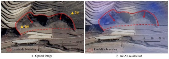 The Jiaowan landslide is a large landslide group located in the Jiaowan Formation, Jiaowan Village, Pingfeng Town, Xiji County. Several major earthquakes mainly induced the landslide on the loess slope on the left bank of the Lanni River in 1920, 1970, and 2008. The slope is steep and covered with loess, the soil is broken, sinkholes have developed, and a small amount of Neogene red mudstone is exposed at the bottom of the gully facing the landslide front. According to the traditional landslide classification by Hungr et al. [], the Jiaowan landslide belongs to soil creep. This area is a typical loess hilly and gully area. The loess beam moves to the northwest, and the terrain inclines from Southeast to Northwest. As a result, the hills and beams are undulating, the gully is crisscrossed, and landslides develop on the slopes of the loess hills. According to the InSAR results, the large landslide group produced new deformation within the monitoring time. The Jiaowan landslide was identified by combining optical remote-sensing interpretation and InSAR technology. The deformed areas in the Jiaowan landslide group were selected for analysis, as shown in Figure 4. The red boundary in Figure 4 represents the landslide range, Figure 4a is the optical image, and Figure 4b is the InSAR recognition result. The quantitative results obtained by InSAR are graded and displayed in different colors. The blue part of Figure 4b represents the settlement area. The deformation rate at Point 6# is 16 mm/a, and the deformation rate at Point 7# is 13 mm/a. Point 7# is located outside the boundary of the landslide, which is more likely to collapse.