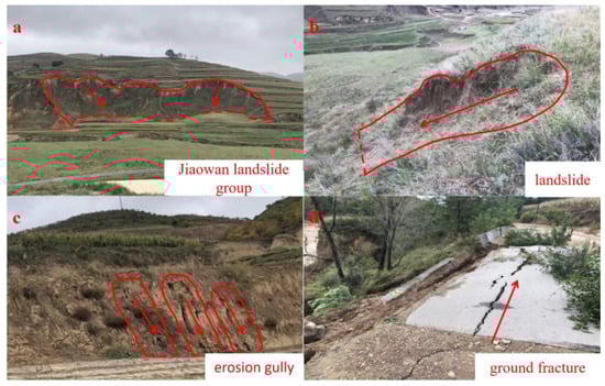Field investigation. (a) Jiaowan landslide group; (b) landslide; (c) erosion gully; (d) ground fracture.