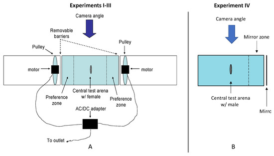 Diagram of apparatus and arenas used for all experiments. (A) Apparatus and arena used for expts. I-III: The subject was placed between a pair of aquaria each housing an adjustable motorized belt and pulley system. The dummy stimuli were attached to the pulley systems situated in the aquaria flanking the central test arena for all behavioral assays. When the apparatus was turned on, the dummy fish began ‘pacing’ back and forth along the glass facing the test arena. An iPad was used to record the subject’s behavior; (B) Arena set up used for expt. IV. Note: Dimensions of the test arena were the same for all experiments.