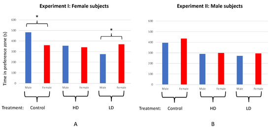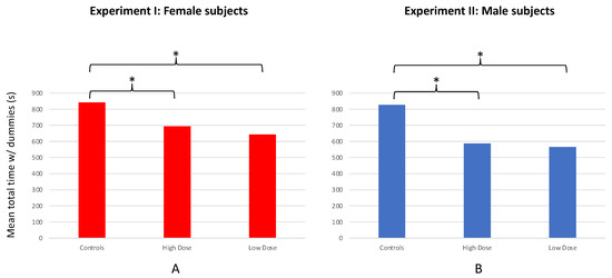 Comparison of mean time low dose, high dose, and control females from expt. I (A) and males from expt. II (B) spent with both stimuli combined. Starred brackets (*) indicate a significant difference between the treatment groups in mean time spent with both dummies combined (paired samples t-tests).