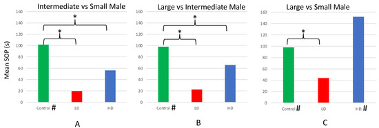 Mean SOP for larger size in the ‘L vs. S’, ‘L vs. I’, and ‘I vs. S’ trials all differed among the HD, LD, and control groups (Figure 5). Specifically, the SOP of control females for the larger male body size was significantly greater than the LD females in the ‘L vs. S’, ‘L vs. I’, and ‘I vs. S’ trials (Figure 5). The SOP of control females in the ‘L vs. I’, and ‘I vs. S’ trials was significantly greater than the HD females, as well. However, no difference in SOP was observed between the control and HD females in their ‘L vs. S’ trials.