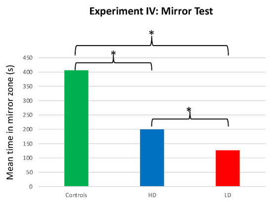 Comparison of mean time spent interacting with the mirror among the LD, HD, and control males of expt. IV. Starred brackets (*) indicates a significant difference in mean mirror time between the treatment groups.