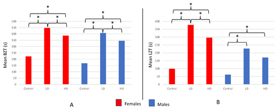 Comparison of (A) time spent in the bottom zone (BZT) and (B) latency to enter the top zone (LTZ) among the LD, HD, and control females (red) and males (blue) from expts. I-IV combined. Starred brackets (*) indicate a significant difference between the treatment groups (e.g., control females vs. LD females).