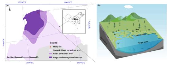 Location of the study area in the Great Hing’an Mountains, Northeast China (a). Spatial distribution of the pelagic zone, littoral zone and bog (b).