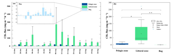 As there was no vegetation cover in the pelagic zone, CH4 ebullition was calculated by subtracting the diffusive flux from the total flux in the float chamber [36,37].