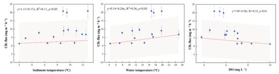 Correlation of total CH4 fluxes in the pelagic zone with sediment temperature, water temperature, and dissolved oxygen (DO). Shaded areas indicate 95% confidence intervals.