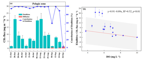Contribution of CH4 ebullition fluxes, diffusive fluxes in pelagic zone. The bars indicate the CH4 fluxes and the line indicates the contribution of ebullition (a). Correlation of CH4 ebullition fluxes in the pelagic zone with dissolved oxygen (DO). Shaded areas indicate 95% confidence intervals (b).