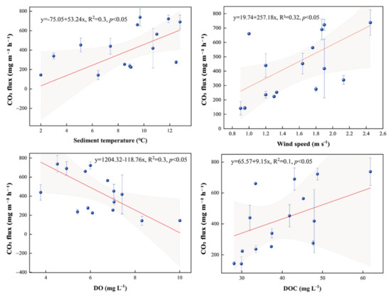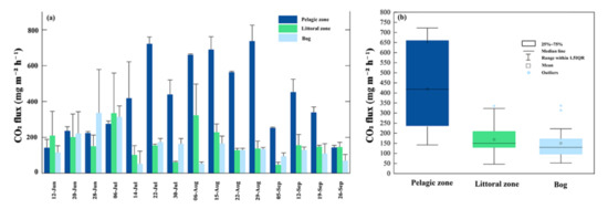 On the temporal scale, CO2 fluxes showed a general trend of increasing and then decreasing over time in the pelagic zone, with higher fluxes in July/August. In the littoral zone, the maximum CO2 fluxes occur in July (Figure 5a). In the bog, peak CO2 fluxes occurred early in the growing season. The mean values for the three sites were 419.76 mg m−2 h−1, 168.41 mg m−2 h−1 and 150.72 mg m−2 h−1, respectively. CO2 fluxes in the pelagic zone were positively correlated with sediment temperature (p < 0.05, Figure 6), wind speed (p < 0.05, Figure 6) and dissolved organic carbon (p < 0.05, Figure 6) and negatively correlated with dissolved oxygen (p < 0.05, Figure 6).