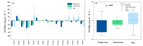 N2O fluxes ranged from −39.22–25.12 μg m−2 h−1, −34.31–12.56 μg m−2 h−1 and −38.73–30.50 μg m−2 h−1 in the pelagic zone, littoral zone and bog, respectively (Figure 7a); their minimum values occur in July. The mean fluxes of N2O at the three sites as sinks were −10.90 μg m−2 h−1, −5.80 μg m−2 h−1 and −0.90 μg m−2 h−1, respectively. There were no significant differences among these three sites fluxes (p = 0.425, Figure 7b). In all sites, N2O fluxes did not correlate with any observed environmental factors (p > 0.05).