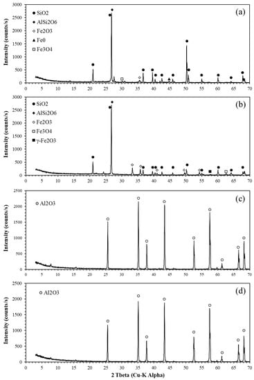 XRD patterns of WCI and α-alumina: (a) raw WCI, (b) WCI after roasting, (c) raw α-alumina, and (d) α-alumina after roasting.