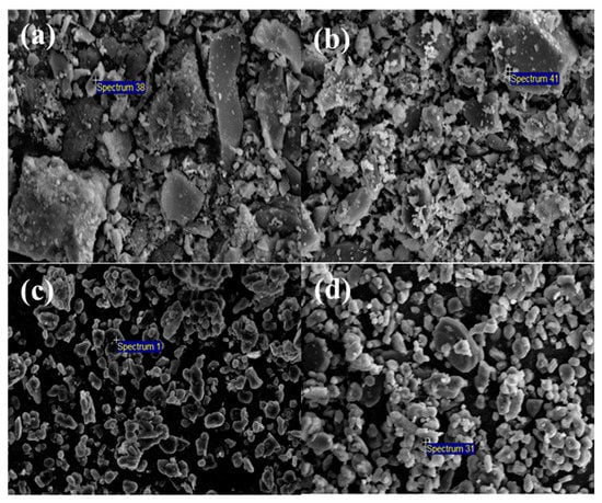 SEM images of WCI and α-alumina: (a) raw WCI, (b) WCI after roasting at 1250 °C, (c) raw α-alumina, and (d) α-alumina after roasting at 1250 °C.