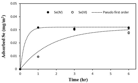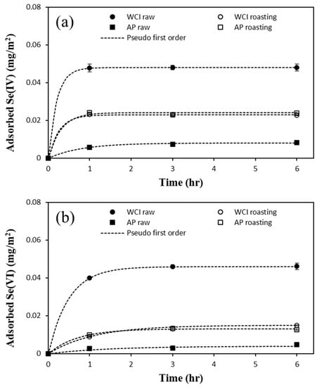 Se(IV) and Se(VI) removal reached equilibrium within 1 and 3 h, respectively, after the initiation of the reaction when raw WCI was used (Figure 3). The kinetics of Se(IV) and Se(VI) removal were consistent with a pseudo-first-order kinetic model (R2 > 0.874) [16,17,18,19]; the fitted values of the model parameters are listed in Table 3. The faster and better removal of Se(IV) compared to Se(VI) was in good agreement with previously reported results [7,20]. This difference can be attributed to the fact that Se(VI) removal is mainly triggered by inner-sphere complexes, whereas Se(IV) removal is triggered by outer-sphere complexes [21].