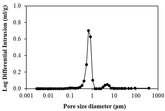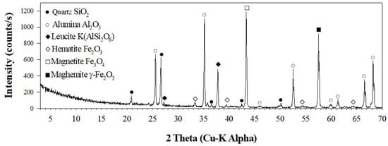 The crystallographic structure of the prepared LFCM was analyzed by XRD. Characteristic peaks of quartz (SiO2), alumina (Al2O3), and leucite (AlSi2O6) could be distinctly observed in the XRD pattern (Figure 4). In addition, peaks corresponding to hematite, magnetite, and maghemite (γ–Fe2O3), which were originally present in WCI, a raw material for iron, were observed. Because of these iron components, LFCM is expected to be effective in the removal of heavy anionic metals from wastewater, including arsenic and selenium [7,13,22]. Fe0, which was present in WCI, was oxidized during the membrane fabrication process and was considered to be transformed into iron oxide. Pore size distribution analysis of the synthesized LFCM (Figure 5) revealed an average pore size of 0.690 μm and porosity of 44.286%. This corresponds to a value small enough to remove kaolin used to simulate suspended matter.
