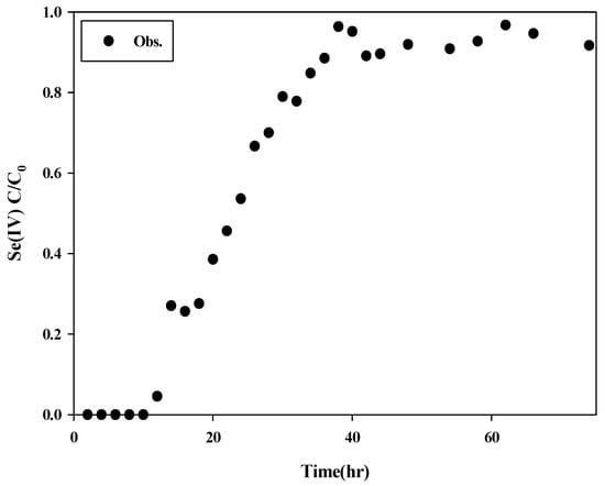 A filtration experiment was performed using artificial wastewater containing turbidity-causing particles and Se(IV). Kaolin, which was used as a turbidity-causing material, did not leak due to the size exclusion effect of the LFCM filtration system (data not shown). This was consistent with the pore size distribution analysis as well as our previous experimental results [23]. In the case of Se(IV), the breakthrough progressed as the activation sites included in the LFCM were saturated, and the Se(IV) concentration in the effluent was close to the inflow concentration (C/C0 = 0.96) after 38 h of operation (Figure 7). The Se(IV) removal capacity of this filtration system was 0.027 mg/m2, which was lower than the equilibrium adsorption capacity calculated before (0.032 mg/m2). However, this indicates that Se(IV) can be effectively removed even while the filtration system is operating. Performance degradation in filtration systems under flow conditions compared to batch systems has also been reported in other studies [24,25].