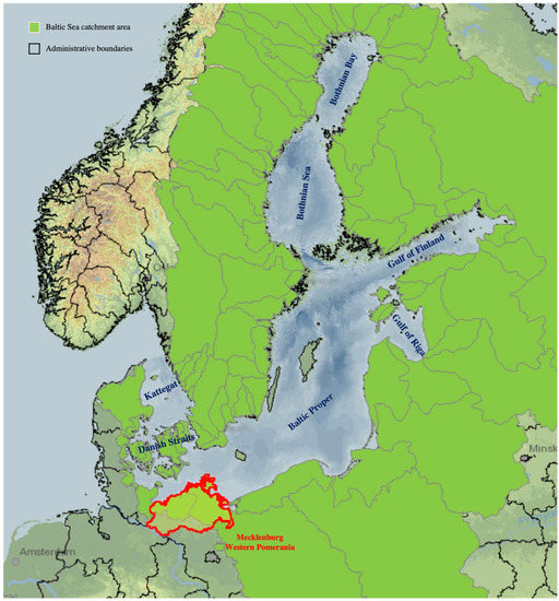 For the analysis, literature was sourced from multiple databases including Google Scholar and Science Direct as well as from topical journals from different publishers including Springer, Elsevier and Wiley. Besides that, ‘snowballing’ was applied. For P specifically, earlier research on policy instruments for sustainable P management of my research unit provided a literature basis [11,28,46,53]. Besides that, literature was sourced from the publication lists of the funding projects InnoSoilPhos (https://www.innosoilphos.de/publications.aspx (accessed on 8 January 2023)) and Leibniz ScienceCampus Phosphorus Research Rostock (https://wissenschaftscampus-rostock.de/research/publications.html (accessed on 8 January 2023)). For the analysis of legal acts, official national sources were used. In Germany, first pillar measures of the CAP are regulated at the federal level, and second pillar measures at the state level (Art. 4 (1) and Art. 9 (1) GAKG) (Gesetz über die Gemeinschaftsaufgabe “Verbesserung der Agrarstruktur und des Küstenschutzes” (GAKG)). Hence, the first pillar is implemented through two federal laws (GAP-Direktzahlungen-Gesetz (GAPDZG) and GAP-Konditionalitäten-Gesetz (GAPKondG)) and two federal regulations (GAP-Direktzahlungen-Verordnung (GAPDZV) and GAP-Konditionalitäten-Verordnung (GAPKondV)). The second pillar programs will be implemented through state regulations but not been adopted yet. The second pillar measures of Mecklenburg-Western Pomerania serve as example because the state has a large coastline along the Baltic Sea (Figure 1). (Proposed) area-related measures of Mecklenburg-Western Pomerania are sourced from an official document published by the Ministry for Climate Protection, Agriculture, Rural Areas and the Environment in September 2022 [61]. Measures which address investment support and knowledge exchange and dissemination of information are sourced from Germany’s revised Strategic Plan as no further details have so far been provided by Mecklenburg-Western Pomerania.