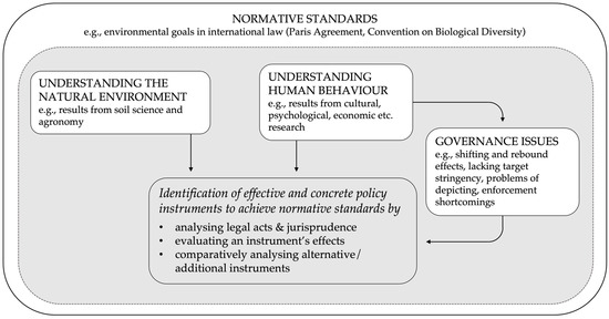 Achieving these legal goals requires effective policy instruments. Policy instruments aim to change the behaviour of the addressees. However, inducing behavioural change is complex. To identify effective and concrete policy instruments, the qualitative governance analysis triangulates findings from different research backgrounds to develop novel insights. It firstly builds on findings from behavioural studies. Previous research shows that, e.g., a lack of knowledge, which informational and educational policy instruments aim at, is seldomly a primary barrier for behavioural change [31,32,33,34]. Instead, emotional factors such as self-interest, anxiety, habits, concepts of normality and path dependencies appear to be important barriers [35,36,37,38]. For example, policy instruments which induce higher prices for resource-intensive products are likely to target concepts of normality by, e.g., making the application of mineral P fertilisers, car driving or eating meat too expensive for regular doing. These barriers equally apply to all humans including farmers, consumers, politicians and entrepreneurs. The qualitative governance analysis takes these complexities into consideration. For example, when proposing an informational instrument, it will frequently be necessary to argue that this instrument alone will be insufficient to achieve substantial behavioural change. Aside from that, the findings from behavioural studies shed light onto potential governance issues of policy instruments. Potential governance issues include enforcement problems, rebound and shifting effects. Rebound effects describe situations where resource savings in one place, e.g., decreased P fertiliser application, leads to rising resource use in another place, e.g., increased cultivation area. Shifting effects describe situations where environmental problems are shifted from one sector to another, or from one region to another, for example due to differing fertilising standards [27] (Chapter 4.4) [28] (shifting effects found by [39,40]). When assessing the effectiveness of existing policy instruments and developing new policy instruments, these instruments are analysed with a view to potential governance issues.