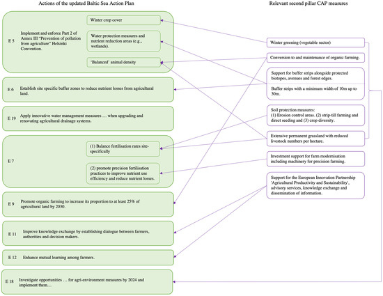 Figure 3 presents the first pillar measures of the CAP which can implement agriculture actions on eutrophication of the updated BSAP. Figure 4 covers second pillar measures. Not depicted in Figure 4 because of their overarching character are two actions. These actions address national instruments and can hence only be implemented through the second pillar of the CAP. E 16 covers a review of national regulations and voluntary measures to reduce P losses from agriculture. E 17 demands national measures to reduce nutrient surplus from fertilisation practices. The analysis below will show that Germany adopted second pillar measures to reduce both P losses from agriculture and P surpluses, and hence covers these actions.