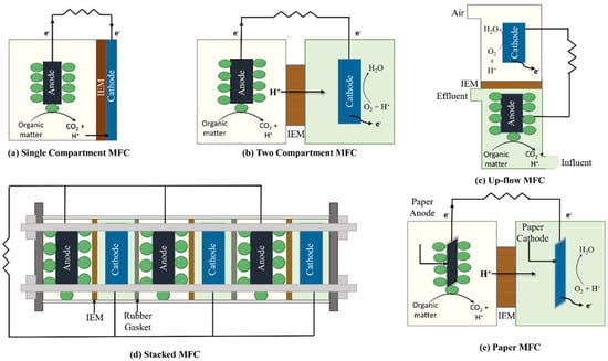 The types of MFCs are differentiated depending upon the presence of an anode chamber, cathode chamber, electrode assembly, and PEM or salt bridge. Different MFCs classified according to their design and mechanism of operation are illustrated in Figure 1.