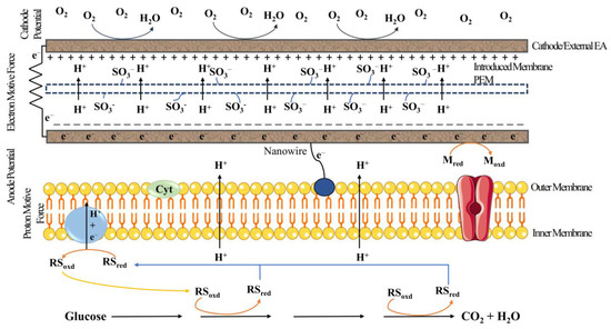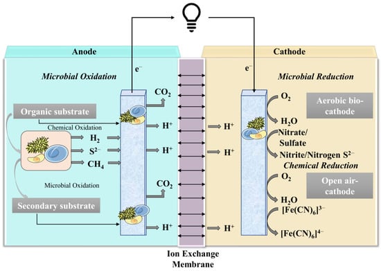The EAB operates as a biocatalyst that further results in the substrate oxidation and transfer of electrons to the anode by direct transfer [63]. Figure 4 depicts proton and electron generation via exoelectrogens and proton transportation across the PEM membrane in MFCs. The indirect transfer can proceed through soluble electron shuttles that initiate the extracellular electron transfer to the anode [64]. MFCs can be composed of electron transfer mediators or a non-mediator. Synthetic materials comprised of dye-based materials, such as phenothiazine, phenazine, indophenol, and thionine, can also be utilized as mediators. Furthermore, in the reaction, electrons produced in the anode chamber move through the external circuit to reach the cathode and generate a current as a result [63,65]. The cathode chamber contains electron acceptors (e.g., O2) that enable reduction reactions, as described below [66]: