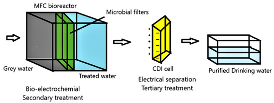 MFCs are relatively new and are one of the promising technologies that facilitate the simultaneous resolution of energy needs and environmental concerns [40,41,42,43,44,45]. MFCs are equipped with the production of biohydrogen, biosensors, and in situ power sources that are utilized for bioremediation collectively with the treatment of wastewater facilities. The rationale that facilitates the use of MFCs for wastewater treatment includes the process of the direct conversion of energy obtained from substrate to electricity, production of controlled activated sludge, insensitivity to the operating environment at low temperatures, their ability to be used without treatment of gas and input of energy for aeration, and their utilization in areas with limited electrical infrastructures [46].