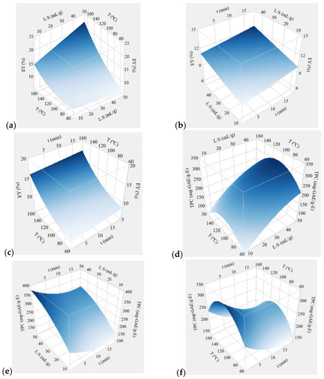 Response surface plots showing the effect of extraction conditions on the extraction yield and total phenolic content of the extract. Surface plots obtained for: (a,d) extraction time of 9.5 min; (b,e) temperature of 110 °C; (c,f) liquid-to-solid ratio of 27.5 mL.g−1.