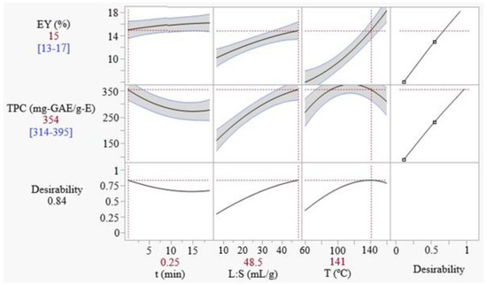 As seen in the previous section, antagonistic responses of EY and TPC are observed with the variation of the extraction time and temperature. Therefore, the desirability approach was used to maximize a function D that combines both responses, as explained in Section 2.4.3. The optimal conditions that maximize the overall desirability D, representing an optimum compromise between EY and TPC, were found as: 15 s, 48.5 mL/g, and 141 °C. The predicted values for EY and TPC are 15 ± 2% and 354 ± 40 mg-GAE/g-E, respectively, corresponding to an overall desirability of 0.84. These predicted responses values are confirmed by experimental values of EY and TPC, obtained under the same conditions (15.3 ± 0.3% and 330 ± 64 mg-GAE/g).