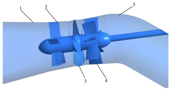 This study’s calculation model software is the modeling software ug10.0 of Siemens. The model can be divided into three parts: the inlet flow channel, the overflow part, and the outlet flow channel. The overcurrent component includes a front guide vane body, a runner body, and a movable guide vane body (Figure 1). Table 1 shows the axial flow pump’s relevant design parameters. The impeller diameter is 1.7 m; the design flow is 10 m3/s; the design head is 2.5 m; the rated speed is 250 r/min, and the number of runner blades is four, that of the front guide vanes is five, and that of the active guide vanes is seven.
