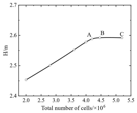Figure 2 is the grid independence analysis. Different points in the figure represent the selection of different grid numbers for verification. Seven sets of grids with different grid numbers were designed using ICEM software to ensure the accuracy of the calculated values and the rational use of computing resources, and the design water head was selected as the reference to verify the grid independence. When the grid number reaches 4 million, the head’s fluctuation error is already within 1%. Due to factors, such as computing resources, the final selection grid is 4.32 million. The impeller area is 2 million; the front guide vane area is 700,000; the rear guide vane area is 800,000; the inlet section is 600,000, and the outlet section is 300,000.