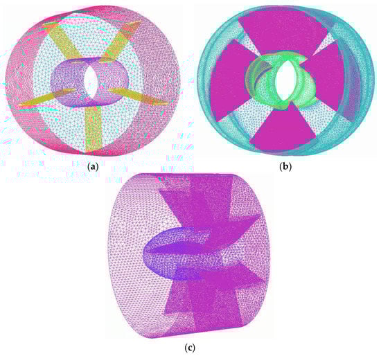 Unstructured mesh in some regions of the axial flow pump in the flow field. (a) Front guide vane area. (b) Turbine blade region. (c) Active guide vane region.