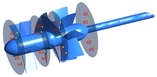 Figure 4 shows the layout of the computational model’s monitoring points. As shown in the figure, four monitoring surfaces are set, located at the inlet of the front guide vane, the inlet and outlet of the runner chamber, and the outlet of the movable guide vane. Four monitoring points are set on each monitoring surface, and 16 points are set to monitor the changes in the pressure pulsation on different interfaces in more detail. The monitoring points are distributed radially on different monitoring surfaces, and the angle between the two groups of monitoring points is 90°. The monitoring points a2 and b3 are located at the outer edge positions of each monitoring surface, consistent with the monitoring positions of the test arrangement.