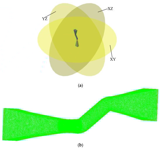 The sound propagation is directional; therefore, the distance and direction of the sound field point setting relative to the sound source will directly affect the spectral noise distribution [17]. To comprehensively study the directional distribution and radiation level of the flow-induced noise of the axial flow pump, with the center of rotation of the runner as the circle’s center, a circular surface with a distance of 50 m from the runner’s center was established on the XY plane, XZ plane, and YZ plane. Figure 5a shows that each surface is radially divided into 12 circumferential directions; a monitoring point is arranged every 10° in each circumferential direction, and 36 monitoring points are arranged on each surface to obtain the axial flow pump’s circumferential sound pressure level distribution law. Figure 5b shows the acoustic calculation grid. For the solution of the indirect boundary element model, it is generally assumed that there are at least six grid cells in the acoustic wave in order to ensure sufficient accuracy of the calculation. It is assumed that the sound velocity in the medium is c, and the length of a single small cell is L. The linear grid cell was used for calculation, and the length of the grid cell of the boundary element satisfies the calculation requirements as follows:
