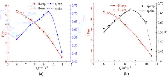 Several operating points under the pump and turbine conditions were selected to verify the accuracy of the numerical simulation results, and the external characteristic curve obtained from the numerical simulation was drawn. Figure 6a,b show the external characteristic curves of the axial-flow pump during forward and reverse operation, respectively. Compared with the characteristic curve of the prototype unit obtained from the experiment, some deviation occurs in the efficiency at a low flow rate; the maximum deviation is within 3%, and the head is slightly lower than the experimental result. The results are close to the experimental values. Due to the calculation model’s deviation, the prototype pump’s local structure, and the influence of the number of meshes, some deviations in the numerical simulation results are inevitable. In general, the simulation results correlate well with the experimental values, and the head and efficiency of the numerical simulation are consistent with the performance trends of the experimental measurements. Therefore, this paper’s numerical simulation results have credibility.