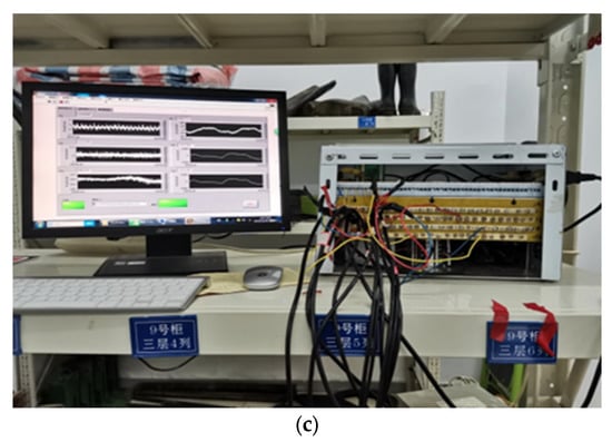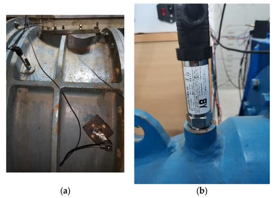Figure 7 shows the site layout during the test of a pumping station, including the layout of pressure pulsation monitoring points, the selected pressure pulsation sensor, and onsite measuring instruments. Restricted by the natural and working environments, the actual machine test selects the test when the speed is 250 r/min. Because the real machine test cannot open holes at random in the unit, according to the unit’s characteristics, holes are opened at the front end of the front guide vane and the front end of the runner. We selected the outer edge of the inlet of the leading vane and the outer edge of the inlet of the runner chamber as the pressure pulsation test points. The specific arrangement is shown in Figure 7a. During the test, we ensured that the pressure sensor was placed vertically with the pipeline. This paper selected the HPT900 high-frequency dynamic pressure sensor provided by Kunshan Yubin Electronic Technology Co., Ltd. (Suzhou China). with an accuracy of 0.5%. Figure 7b shows the pressure sensor arrangement.