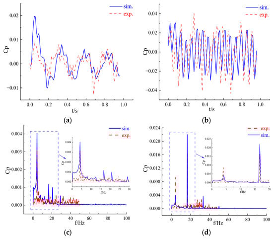 Comparison of experimental and numerical simulation results. (a) Time domain diagram of inlet pressure pulsation of preguide vanes. (b) Time domain diagram of runner inlet pressure pulsation. (c) The frequency domain diagram of the inlet pressure pulsation of the front guide vane. (d) Frequency domain diagram of runner inlet pressure pulsation.