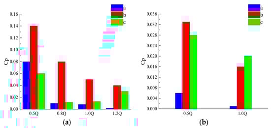 During the axial flow pump’s operation, pressure pulsation is formed due to the hydraulic excitation caused by the unit’s vibration and the rotation of the blades. Its variation law is frequently overly complicated by many factors. This paper uses a peak-to-peak value with a confidence level of 97% as the index to investigate the pressure pulsation. Figure 9 shows the pressure pulsation with 97% confidence; the vertical axis is the pressure coefficient, and the horizontal axis is the monitoring surface under different flow conditions (a, b, and c) in the legend corresponding to a3, b3, and c3, respectively. This paper only focuses on the pressure pulsation distribution at the inlet and outlet of the runner chamber. Under the pump condition (Figure 9a), the pressure coefficient decreases with the increase in flow, except for at the runner’s outlet when the flow is large. Under the same flow conditions, the peak-to-peak value of the pressure pulsation at the runner’s inlet is the largest, indicating that the pressure pulsation changes violently here. When the unit is in the working condition of the turbine, with an increase in the flow rate, the peak-to-peak value of the pressure pulsation of each monitoring surface decreases. The peak-to-peak value of the pressure pulsation at the runner’s inlet and outlet is much larger than the pressure pulsation in the nonblade area, indicating that the blade rotation strengthens the hydraulic excitation, and the guide vanes can improve the water flow effectively. The peak-to-peak value of the pressure pulsation during forward operation is much larger than that during the reverse operation, indicating that when the pump is operating under the operating condition, the internal pressure pulsation of the unit is larger, the hydraulic excitation is pronounced, and there should be damage to the unit’s overcurrent components. If it is larger, operating under reasonable flow conditions is necessary.
