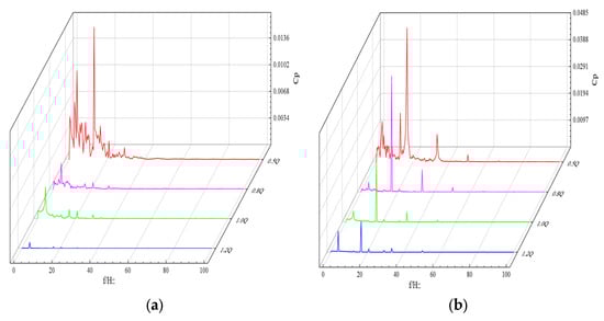 Under different flow rates on different monitoring surfaces, the primary and secondary frequencies of pressure pulsation are noticeable when the unit is in the turbine condition, and no spurious frequency occurs (Figure 11). In the vaneless area away from the runner chamber, the primary pressure pulsation frequency is the rotational frequency, and the secondary frequency is its multiplier. At the runner chamber’s outlet, the primary frequency of the pressure pulsation is the vane frequency, and the secondary frequency is the rotational frequency and its multiplier. On the runner’s inlet section, the primary frequency of the pressure pulsation is the pilot frequency, and the secondary frequency is the rotational frequency and its multiplier. The pressure pulsation spectrum distribution is consistent under different flow conditions, and with the increase in the flow rate, the pressure pulsation amplitude decreases, indicating that the higher the flow rate, the better the flow state, and the smaller the pressure pulsation, the more stable the operation. In the dynamic and static interference areas near the runner chamber, the pressure pulsation is much larger than the pressure pulsation amplitude in the vaneless area.
