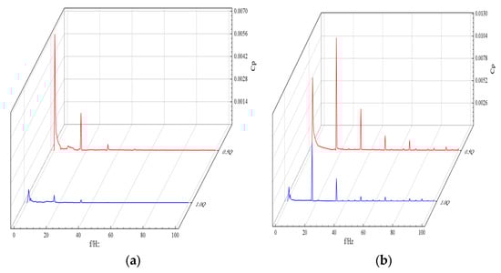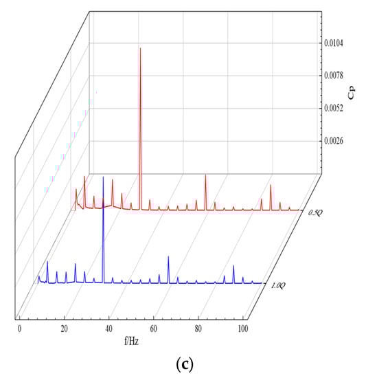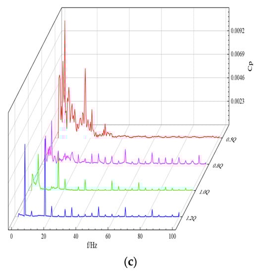 Fourier transform was performed on the previously selected pressure pulsation data. We obtained the frequency domain distribution of the pressure pulsations. Figure 10 and Figure 11 are the frequency domain distribution of pressure pulsation on different monitoring surfaces under the pump and turbine conditions, respectively. Figure 10 shows that the pressure pulsation is extremely unstable on different monitoring planes when the unit operates at a low flow rate. Clutter frequencies of different sizes occur. When operating near the design flow, the primary and secondary frequencies of the pressure pulsation frequency domain of each monitoring surface are noticeable, and no clutter frequency occurs. When the axial flow pump is running in low flow conditions, the flow state in the runner is poor, and reflux, flow separation, and other phenomena can easily occur. The primary frequency is at the blade, and the secondary frequencies are at the runner’s inlet and outlet. For the rotation frequency and its multiplication, the primary frequency of the pressure pulsation is the rotation frequency, and the secondary frequency is the rotation frequency multiplication far from the bladeless area. The figure shows that the amplitude of the primary frequency of the pressure pulsation at the runner’s inlet is the largest at the same flow rate. The water flow from the front guide vane area enters the runner chamber and impacts the blades, and the rotation of the blades drives the flow of the water body. The pulsation is much stronger than that in the leafless region.