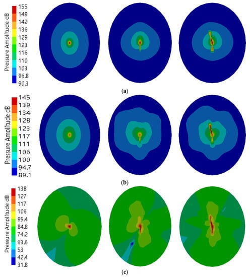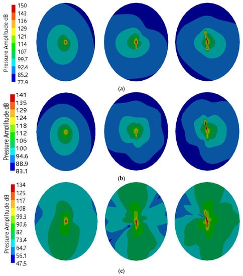 Amplitude distribution of sound pressure amplitude in pump conditions. (a) 1.0 Q first-order leaf frequency sound pressure amplitude. (b) 1.0 Q second-order leaf frequency sound pressure amplitude. (c) 1.0 Q third-order leaf frequency sound pressure amplitude.
