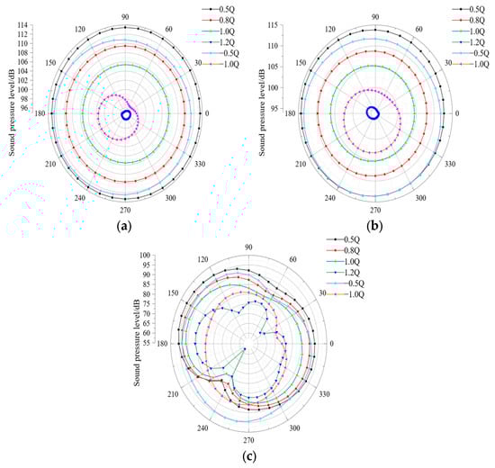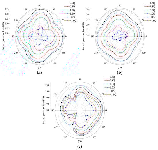 Figure 14 and Figure 15 are the directivity distributions of flow-induced noise at different positions of the XY plane from the sound source. In the figure, −0.5 Q and −1.0 Q represent the flow conditions corresponding to reverse operation. With the change in the flow rate, the influence of the external noise radiation capacity is the weakest under large flow conditions and the strongest under small flow conditions. Under the low flow condition, the water flow in the outlet channel is insufficient to supplement the cavity position, aggravating the formation of the eddy current and affecting the noise radiation. This result is consistent with the previous effect of pressure pulsation changes. When the pump is running in a low flow condition, the flow state inside the runner is worse, and the low-frequency band of pressure pulsation appears cluttered. At the same time, the noise pressure value also increases significantly compared with the rated condition.