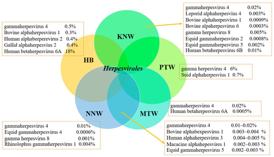 Herpesvirales in human blood and all water samples. Percentage (%) values represent the percentage of the virus among all viruses. Key: HB, pooled human blood samples; MTW, tap water from Mae Ka (No. 1); PTW, tap water from Wiang Subdistrict; KNW, natural water from Kwan Phayao; NNW, natural water from Huai Na Poi.