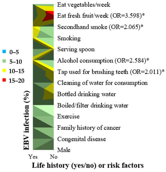 Life history (yes/no) and risk factors for EBV infection (%) in blood based on the three methods. The color represents the percentage of exposure to environmental risk factors: 0–5%, blue; 5–10%, green; 10–15%, yellow; and 15–20%, red. Male, congenital disease, family cancer history, exercise, and boiled/filtered drinking water were not risk factors for EBV DNA detection in blood. Not using tap water for brushing teeth, alcohol consumption, secondhand smoke exposure, and not eating fresh fruit weekly were risk factor factors for EBV DNA detection in blood. Note: not using tap water for brushing teeth reflects the use of other water sources, such as rain/artesian water. Key: *, statistically significant (p < 0.05).