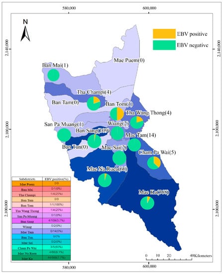 GIS-connected oncogenic EBV prevalence data from human blood samples in the 15 Mueang subdistricts highlights the EBV distribution. EBV-positive means EBV-positive in human blood.