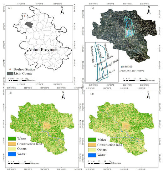 Study area. (a) Location of Lixin County; (b) Location of the smart soil moisture monitoring instrument (SSMMI); (c) Crop classification map of wheat; (d) Crop classification map of maize.