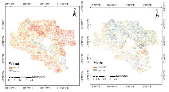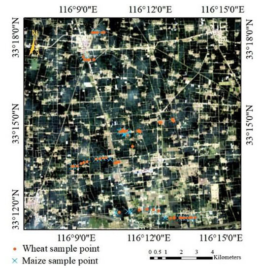 Lixin County (N 32°51′–33°27′, E 115°54′–116°31′) is in the northwest of Anhui Province, which is shown in Figure 1. The total area is approximately 2005 km2, with a population of 1.236 million. The terrain slopes gently, with an average elevation of 28 m. Arable land resources are abundant, with 1.44 ha of arable land per capita. Lixin County is located in a semi-humid monsoon climate zone, with an average annual temperature of 14.8 °C and an average annual precipitation of 824 mm. The winter is dry and less rainy, and the summer is hot and rainy. The summer harvesting crop is mainly wheat, and the autumn harvesting crop is mainly maize. The classification maps of wheat and maize in Figure 1 are extracted from Landsat images using the decision tree classification method.