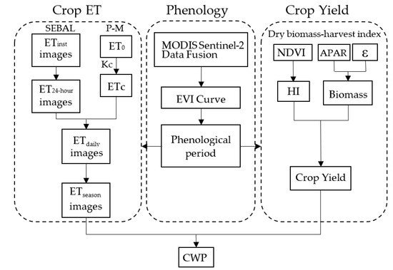 Crop water productivity (CWP) is the ratio of crop yield to ET during the growing season. Crop phenological period is detected from EVI curves based on MODIS and Sentinel-2 data. Crop seasonal ET (ETseason) is calculated by the SEBAL and P-M methods. Crop yield is estimated by the dry biomass–harvest index method. For accurate ET and yield estimation, the dates of crop phenological period are added to the processes of crop ET and yield estimation. The methodology framework is shown in Figure 3.