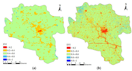 The data fusion effect. (a) MOD09A1-EVI image before fusion on 5 September 2020; (b) EVI image after data fusion.