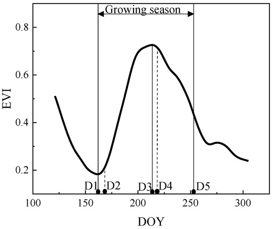On the basis of crop classification maps, phenological periods of wheat and maize are detected in the crop-planting regions. The crop phenological periods are classified into sowing (D1), emergence (D2), heading (D3), anthesis (D4), and maturity (D5) periods. Figure 5 shows an example of the EVI time series curve and the metrics for detecting phenological periods. The sowing, heading, and maturity periods are feature points in EVI time series curves, so they are detected using the slope method from the curves [34,35]. The emergence and anthesis periods were detected according to other studies [36,37]. The approaches for detecting phenological periods can be expressed as: